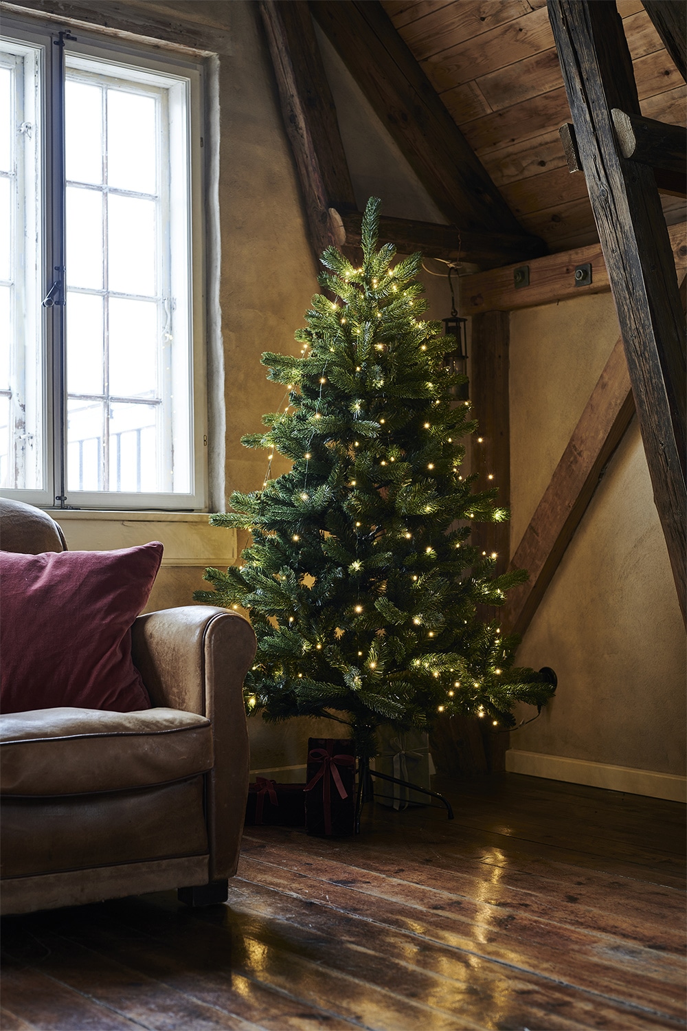 Klassisk juletræ i en flot naturtro grøn farve. Der medfølger juletræslyskæde som lyser med et varmt hvidt LED lys, den giver et næsten usynligt look med svævende lys pga. den tynde grønne metaltråd lysene er monteret på. Nem at montere på toppen af træet