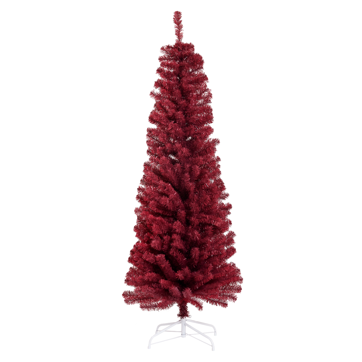 180 cm høj 68 cm bred (nederst) Mørkerød gran farve (hvidt stel) Træet leveres uden LED lys Træet leveres med sammenklappelig metalfod Kan bruges år efter år, fælder ikke og er allergi venligt Smalt mørkerødt kunstigt juletræ uden lys på 180 cm Gør din ju