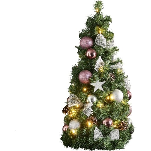 “Kegleformet kunstigt juletræ med julepynt Dette søde lille juletræ kommer med julepynt i sølv og pink, så du slipper for at pynte det op. Super let bare at placere hvor du vil indenfor, uden at skulle bøvle med at pynte det op før du kan nyde det.De